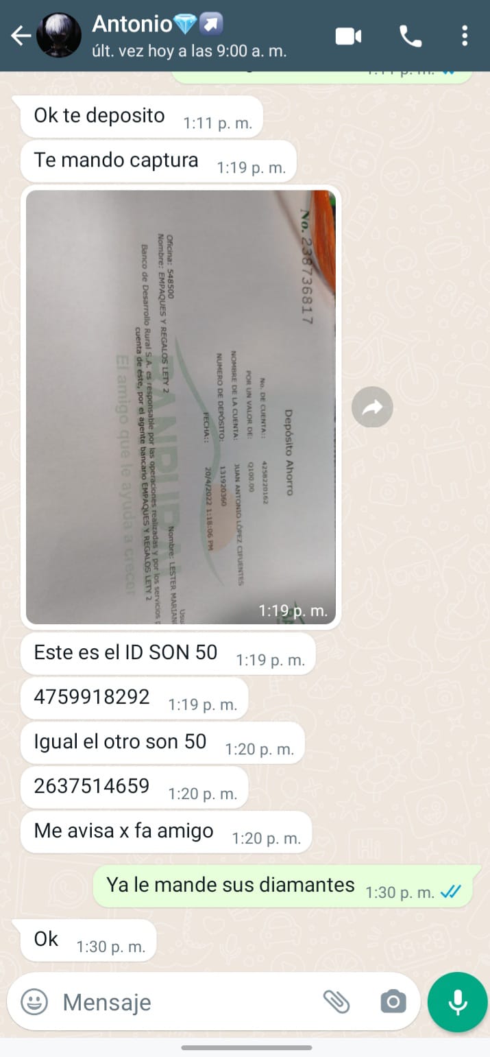 Listo, te confirmaremos cuando te hayamos enviado la recarga o tus diamantes que sera en menos de 1 minuto.